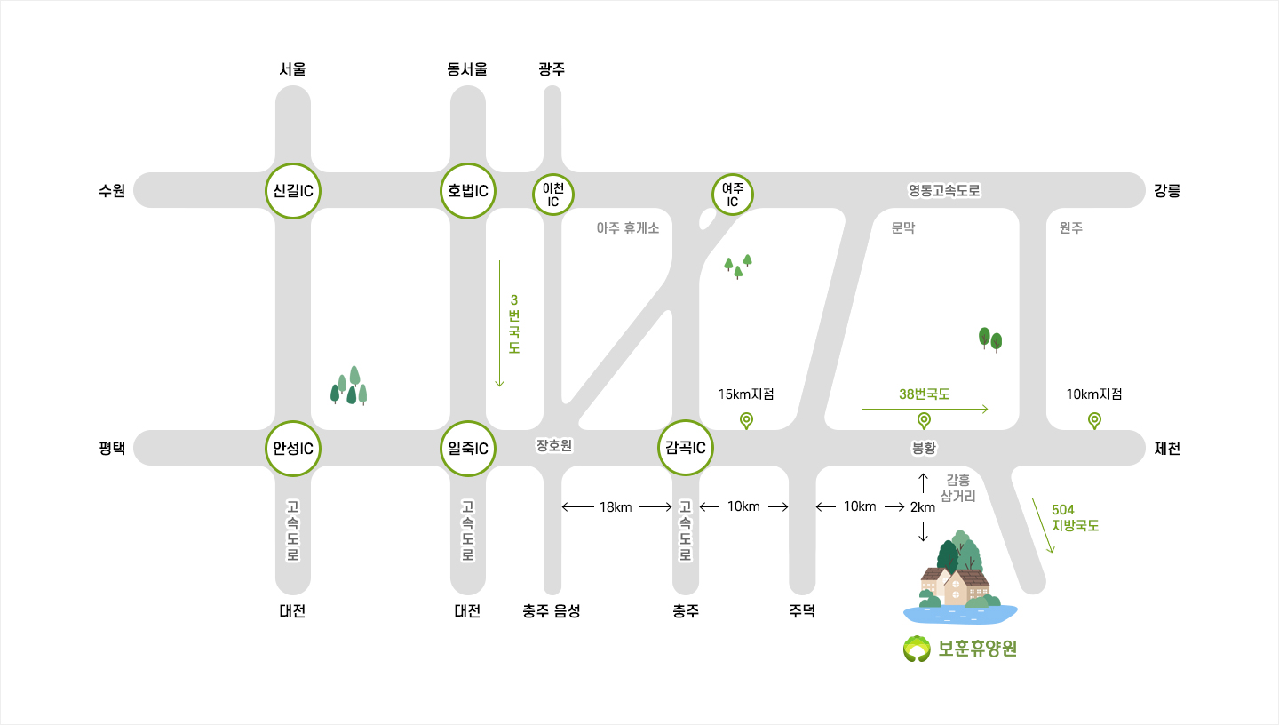 장호원 방면 38번 국도를 달리면 가흥삼거리가 나오며, 이곳에서 2Km쯤 달리면 좌측에 "충주보훈휴양원"이라는 안내간판이 보입니다.